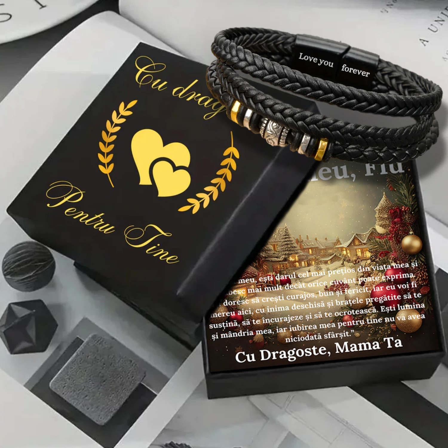 - Cutie eleganta: Dimensiuni 84 x 84 mm, inscriptionată cu mesajul „Cu dragoste pentru tine” în folie aurie