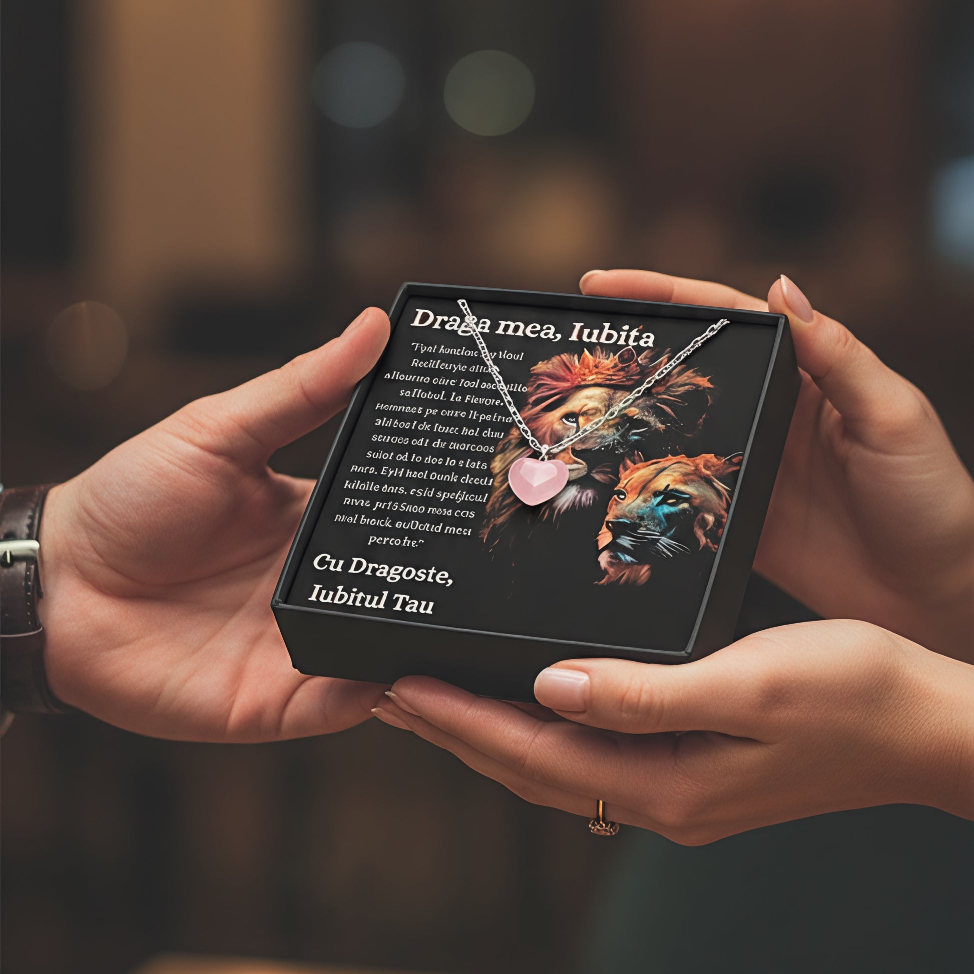 Cadou Iubita Colier cu piatra Quart simbolul iubirii si cutie cu mesaj de dragoste